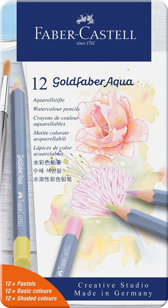Die Pastellvariante Goldfaber Aqua Aquarellstifte stehen dank einer neuen, innovativen Technologie in Bezug auf Schluesselkriterien wie Weichheit der Mine, Leuchtkraft, Lichtbestaendigkeit und Wasservermalbarkeit fuer hoechste Qualitaet. 12 Stifte mit der hoch pigmentierten 3,3 mm Mine im Metalletui.