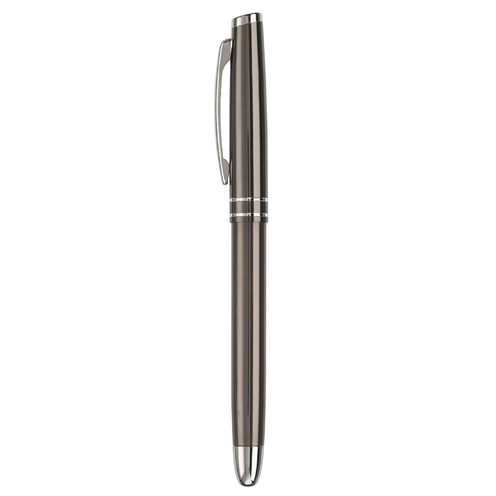 Metallschreibset bestehend aus einem Kugelschreiber mit Drehmechanik und einem Rollerball mit Kappe. Versehen mit einem feinen Streifendesign. Blauschreibend.