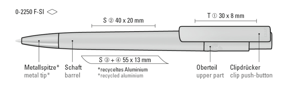 Druckkugelschreiber aus recyceltem PET-Material mit matt gedecktem Gehäuse und Clip sowie Metallspitze aus recyceltem Aluminium in silber matt.