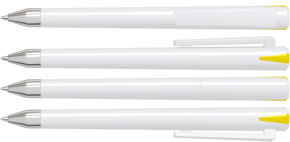 Drehkugelschreiber mit gedeckt glänzendem Gehäuse und Oberteil mit zwei farbigen Stopfen in gedeckt oder transparent. Schwere Metallspitze glanzverchromt.