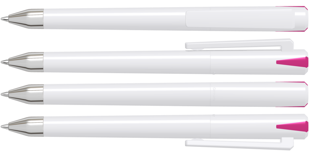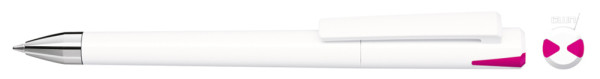 Drehkugelschreiber mit gedeckt glänzendem Gehäuse und Oberteil mit zwei farbigen Stopfen in gedeckt oder transparent. Schwere Metallspitze glanzverchromt.
