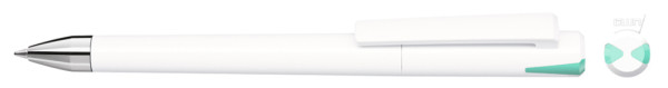 Drehkugelschreiber mit gedeckt glänzendem Gehäuse und Oberteil mit zwei farbigen Stopfen in gedeckt oder transparent. Schwere Metallspitze glanzverchromt.
