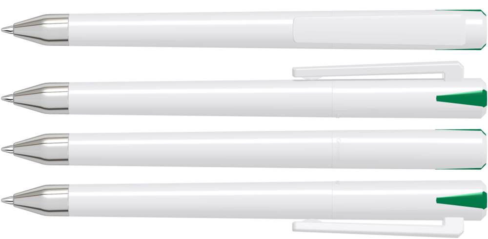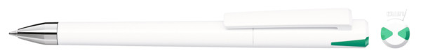 Drehkugelschreiber mit gedeckt glänzendem Gehäuse und Oberteil mit zwei farbigen Stopfen in gedeckt oder transparent. Schwere Metallspitze glanzverchromt.