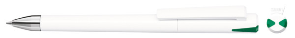 Drehkugelschreiber mit gedeckt glänzendem Gehäuse und Oberteil mit zwei farbigen Stopfen in gedeckt oder transparent. Schwere Metallspitze glanzverchromt.