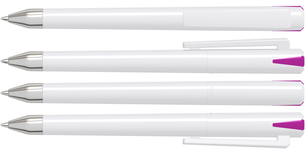 Drehkugelschreiber mit gedeckt glänzendem Gehäuse und Oberteil mit zwei farbigen Stopfen in gedeckt oder transparent. Schwere Metallspitze glanzverchromt.