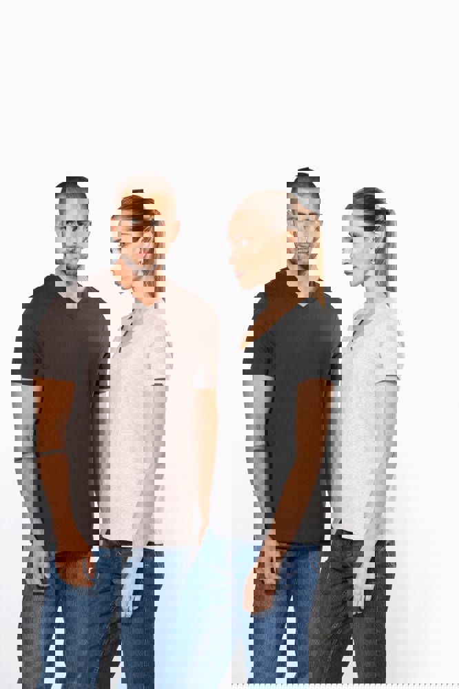 100% gekämmte Baumwolle, Enzymwäsche veredelt (Ash Heather : 98 % Baumwolle /2 % Viskose. Oxford Grey : 90 % Baumwolle /10 % Viskose). Gerader Schnitt. Nackenband (Oxford Grey bei farbigen Shirts, White bei weißen Shirts, Dark Grey bei Shirts in Oxford Grey). Doppelnähte an Ärmeln und Saum.