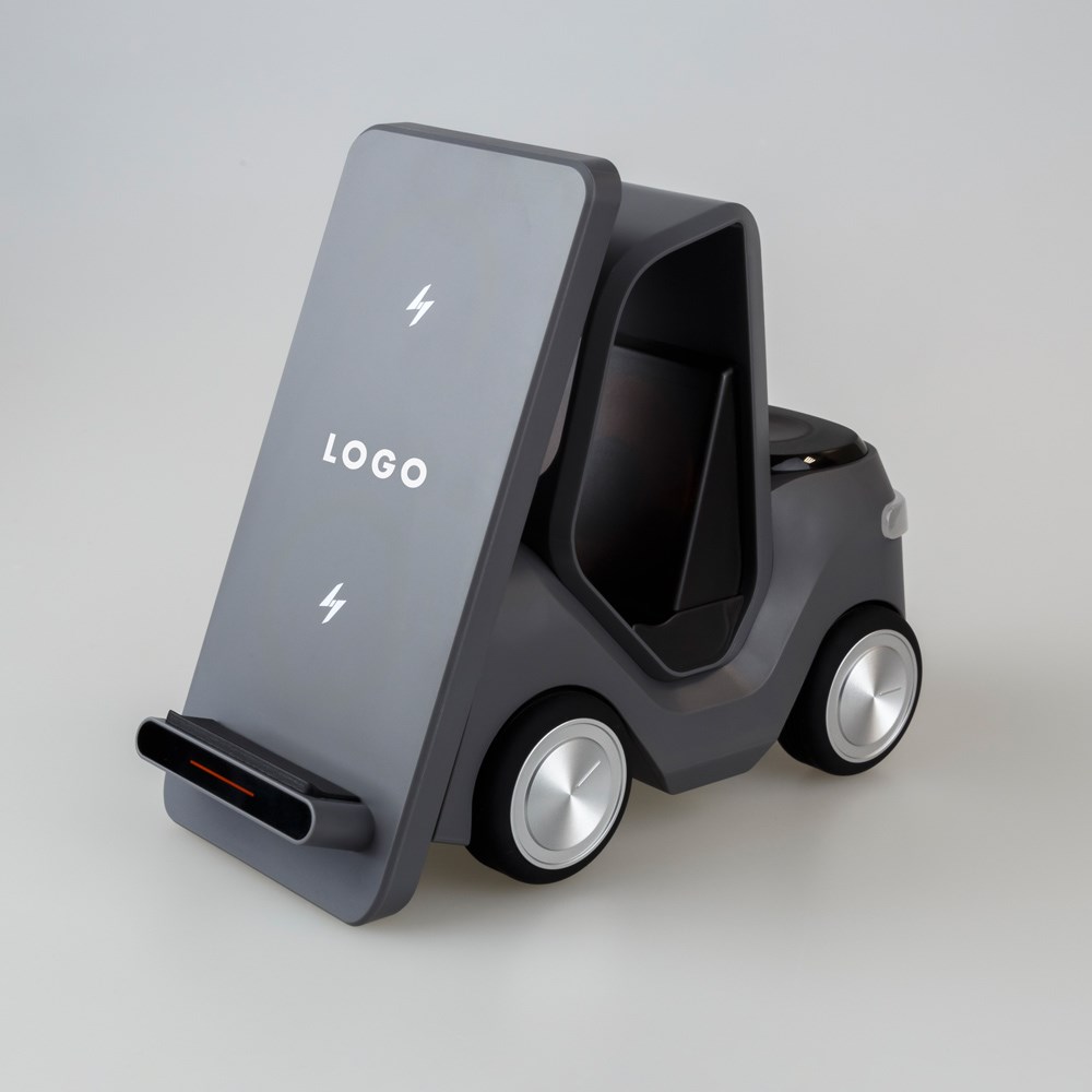 Originelles Ladegerät im Gabelstapler-Design für Apple Watch, AirPods und QI-fähige Smartphones. Kabelloses Laden mit bis zu 15 W und einstellbares Rücklicht für stimmungsvolle Akzente. USB-C-Anschluss und optionaler Druck für individuelle Logos.