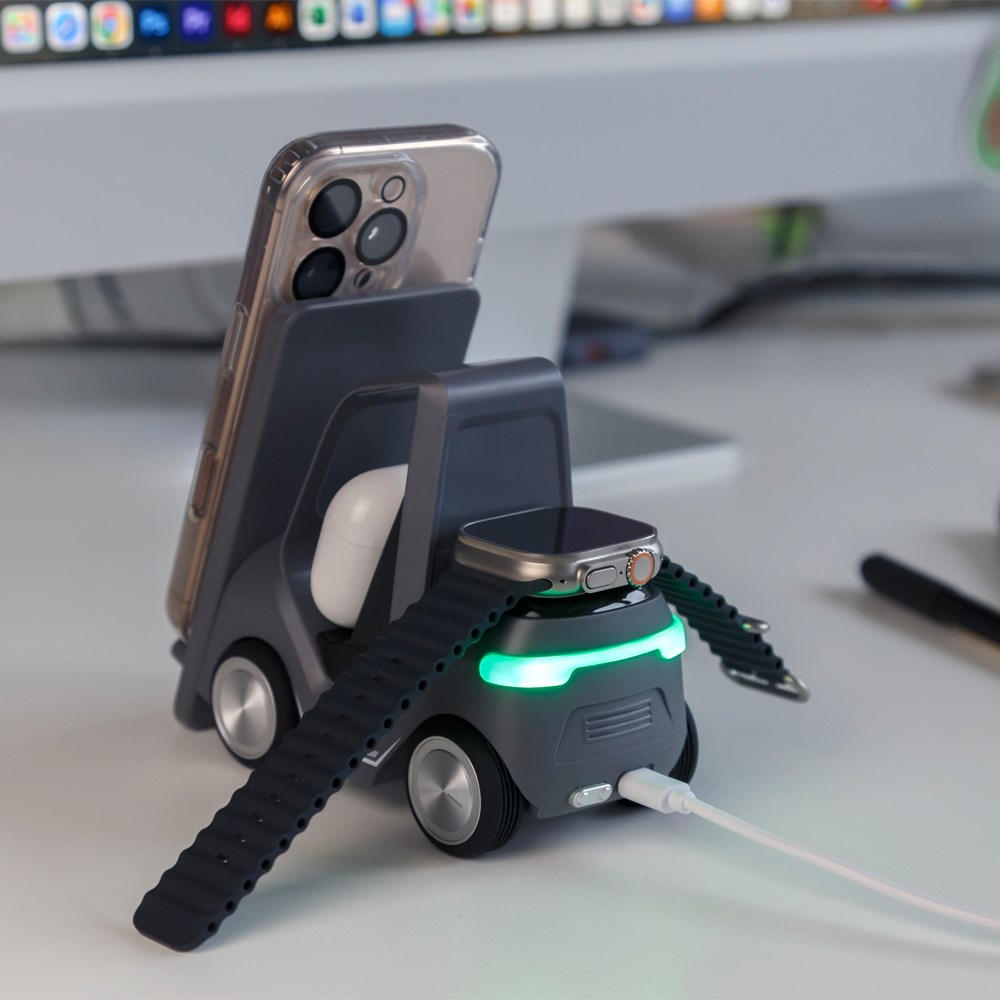 Originelles Ladegerät im Gabelstapler-Design für Apple Watch, AirPods und QI-fähige Smartphones.... mehr