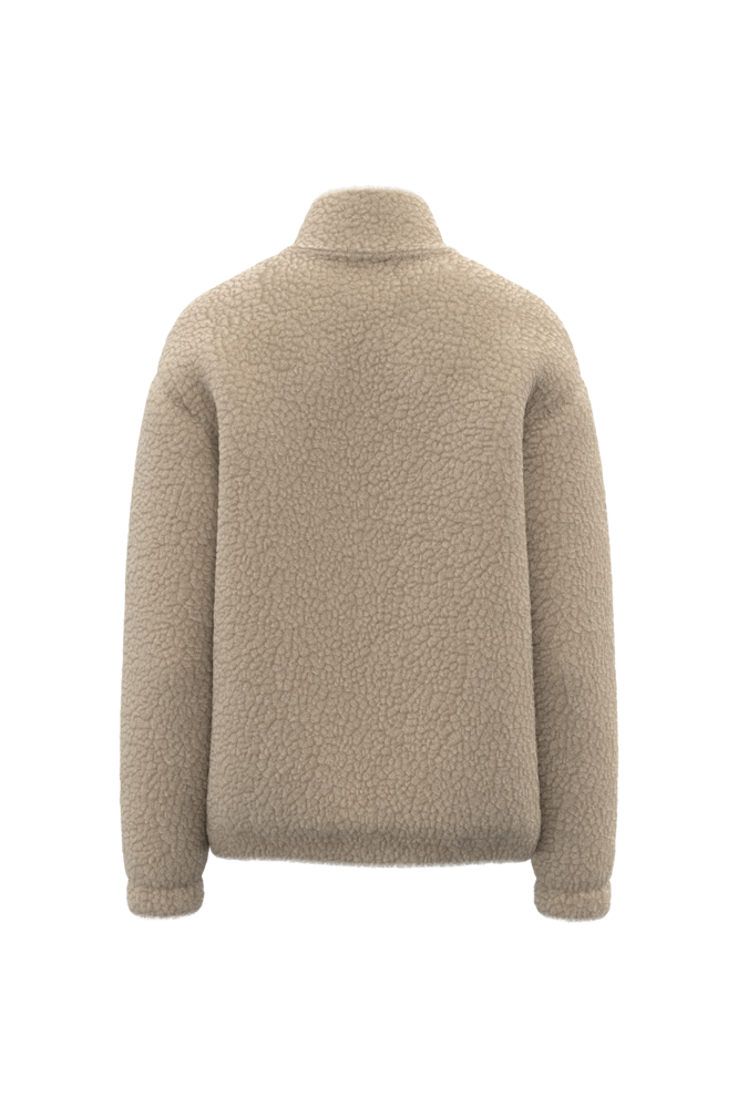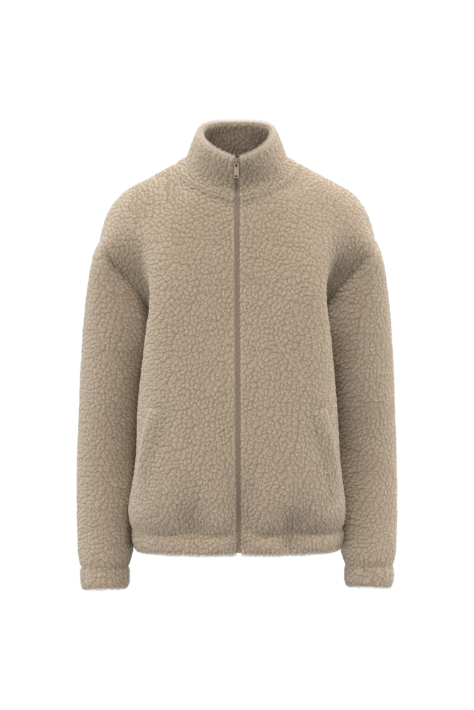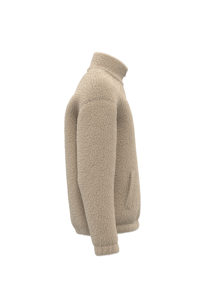 100 % Polyester. Reguläre Passform mit überschnittener Schulterpartie. Sherpa-Material mit Hauptfutter aus Jersey und Ärmelfutter aus Taft für ein einfaches Anziehen. Doppelter Stehkragen aus Hauptmaterial. Krageninnenseite mit Nackenband mit tonalem Fischgrätenmuster. Kunststoffreißverschluss mit Ton-in-Ton-Metallschieber. Elastische Ärmelbündchen und Saum. Zwei paspelierte Taschen auf der Vorderseite. Reißverschluss zur individuellen Veredelung am unteren Rand des Kleidungsstücks.