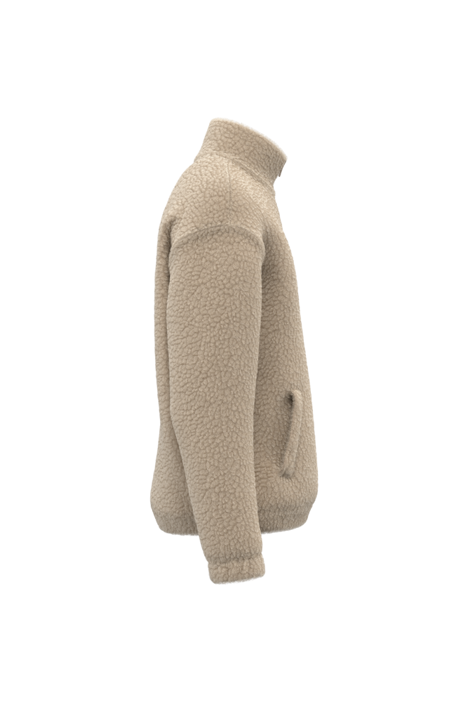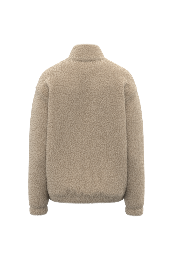 100 % Polyester. Reguläre Passform mit überschnittener Schulterpartie. Sherpa-Material mit Hauptfutter aus Jersey und Ärmelfutter aus Taft für ein einfaches Anziehen. Ein mit Hauptmaterial gefütterter Stehkragen mit Reißverschluss und einem Ton-in-Ton-Metallschieber. Krageninnenseite mit Nackenband mit tonalem Fischgrätenmuster. Elastische Ärmelbündchen und Saum. Zwei paspelierte Taschen auf der Vorderseite. Reißverschluss zur individuellen Veredelung am unteren Rand des Kleidungsstücks.