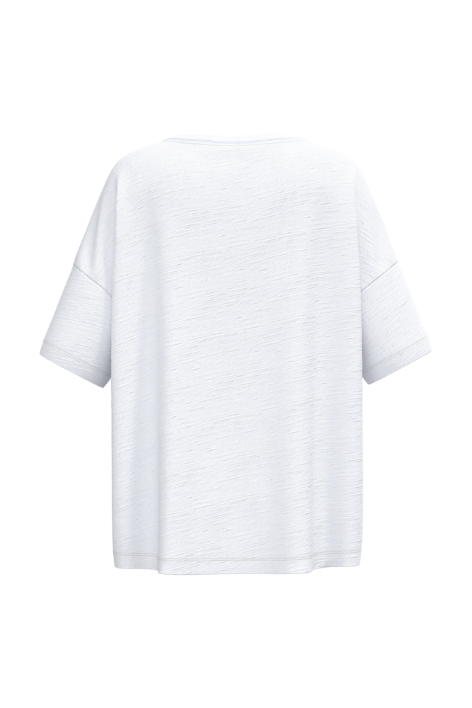 100 % Bio-Baumwolle. Gekämmte Baumwolle. Jersey-Strick in Flammoptik. Oversized-Schnitt mit überschnittener Schulterpartie. Enzymwäsche. Seitennähte. Rundhalsausschnitt mit 1x1-Rippstrickbündchen. Schulterverstärkung. Innenseite des Kragens mit einem Nackenband aus tonalem Hauptmaterial. Doppel-Ziernaht an Ärmelbündchen und unterem Saum.