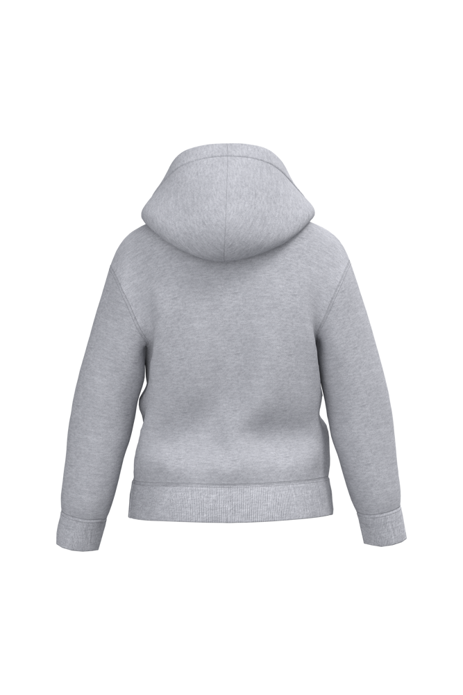 50% ringgesponnene Baumwolle / 50% recyceltes Post-Consumer-Polyester. Gebürstetes Molton. Gerader Schnitt. Geschnitten und genäht. Enzymwäsche. Schlauchförmige 2x1-Rippenbündchen für einen besseren Abschluss am Kragen, an den Ärmelenden und am Saum. Doppelte Ziernähte an Schultern, Armlöchern, unterem Saum und Ärmelabschluss. Kängurutaschen. Kapuze mit Jersey gefüttert. Ton-in-Ton-Jerseystreifen an der Innenseite des Kragens. Kein Markenetikett am Halsausschnitt, nur Größenangabe, zur einfacheren Veredelung.