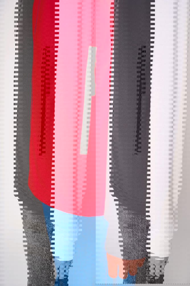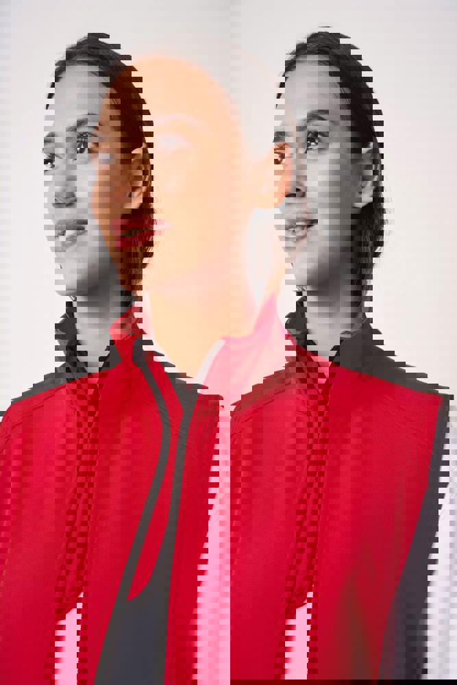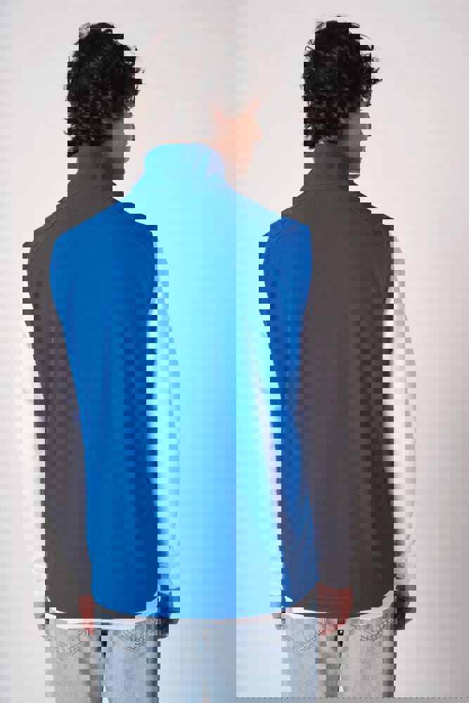 95 % Polyester / 5 % Elasthan. 2-Lagen-Softshell mit wasserabweisender Ausrüstung. Innen: 100 % Polyester in schwarzem Mikrofleece. Gerader Schnitt. Zwei Seitentaschen mit Polytrikot gefüttert, mit Nylon-Reißverschlüssen und schwarzen Reißverschlussanhängern. Schwarzer Nylon-Frontreißverschluss mit Kinnschutz und Zipper. Schulter- und Rückeneinsätze mit Ziernähten. Schwarzes Nackenband. Doppelnähte an Armausschnitten und Saum. Abreißbares Markenetikett.