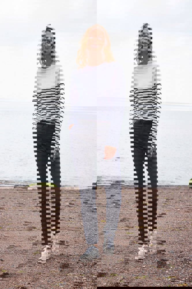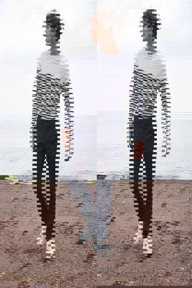 100 % Baumwoll-Jersey. Dickes Unisex-T-Shirt mit langen Ärmeln, klassischem Schnitt und ohne Etikett. Rundhalsausschnitt mit dehnbarem, geripptem Halsausschnitt. Saum und Ärmel mit Doppelziernaht. Flachnaht-Motiv in „V“-Form am Ausschnitt. Gestreiftes Unterteil.