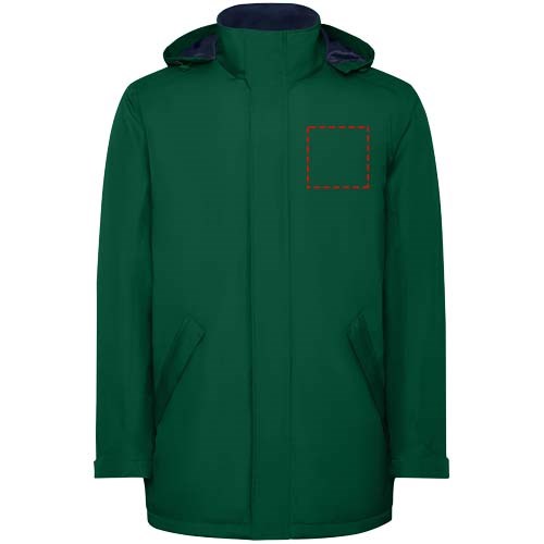 Wasserabweisende, wattierte Parkajacke für Herren. Hoher Kragen mit einrollbarer und abnehmbarer Kapuze mit Klettverschluss. Mittig durchgehender Reißverschluss mit Patte. Seitentaschen mit Reißverschluss und fester Patte. Innentasche mit Klettverschluss. Verstellbare Ärmelbündchen mit Klettverschluss. Verstärkungen im Rücken und auf der linken Brust.
