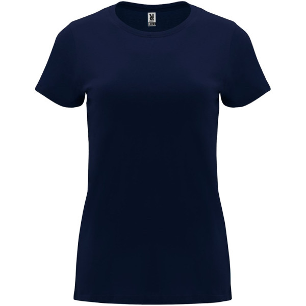 Tailliertes kurzärmeliges T-Shirt für Damen. Rundhalsausschnitt mit 1×1 Rippstrick. Verstärkte und verdeckte Nähte am Kragen. Herausnehmbares Etikett.