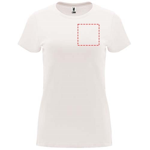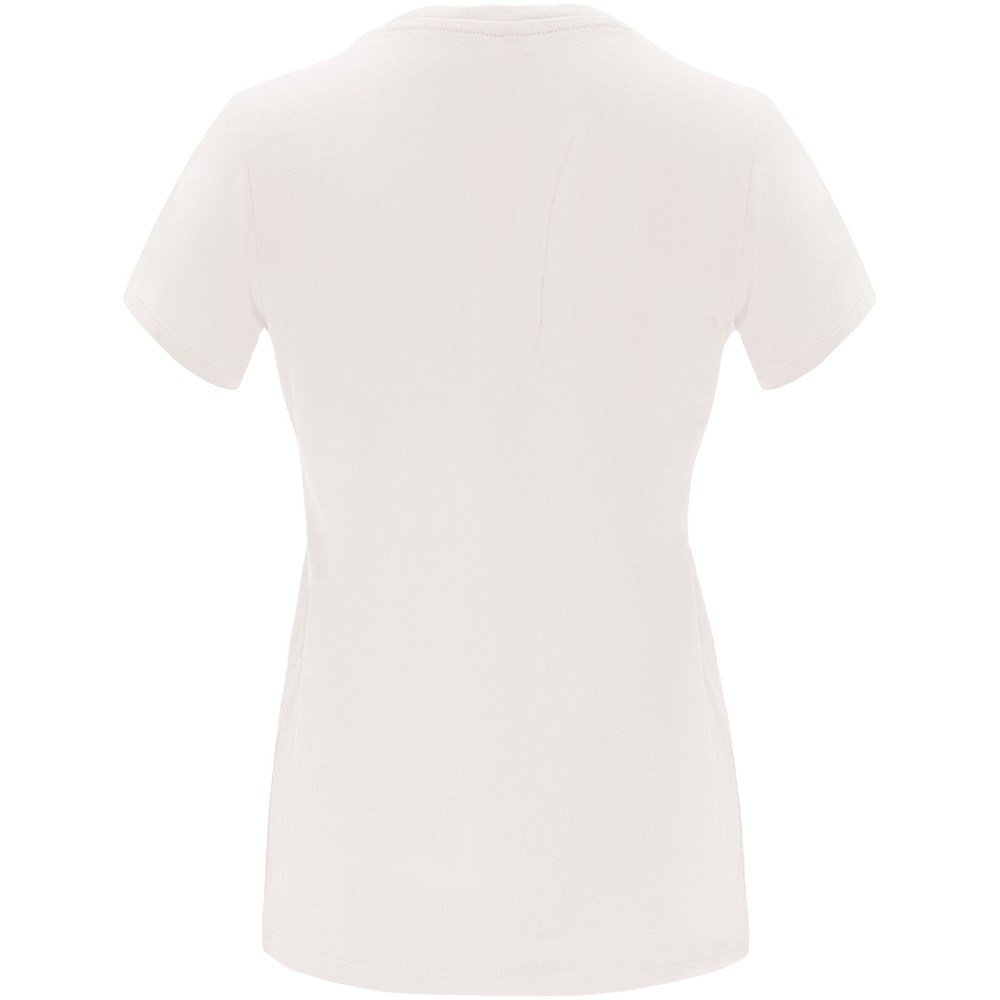 Tailliertes kurzärmeliges T-Shirt für Damen. Rundhalsausschnitt mit 1×1 Rippstrick. Verstärkte und verdeckte Nähte am Kragen. Herausnehmbares Etikett.