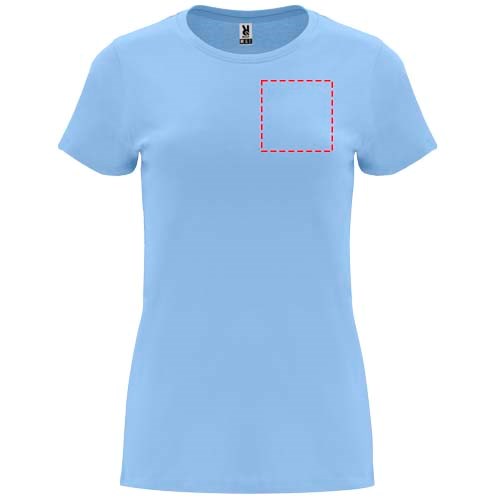 Tailliertes kurzärmeliges T-Shirt für Damen. Rundhalsausschnitt mit 1×1 Rippstrick. Verstärkte und verdeckte Nähte am Kragen. Herausnehmbares Etikett.