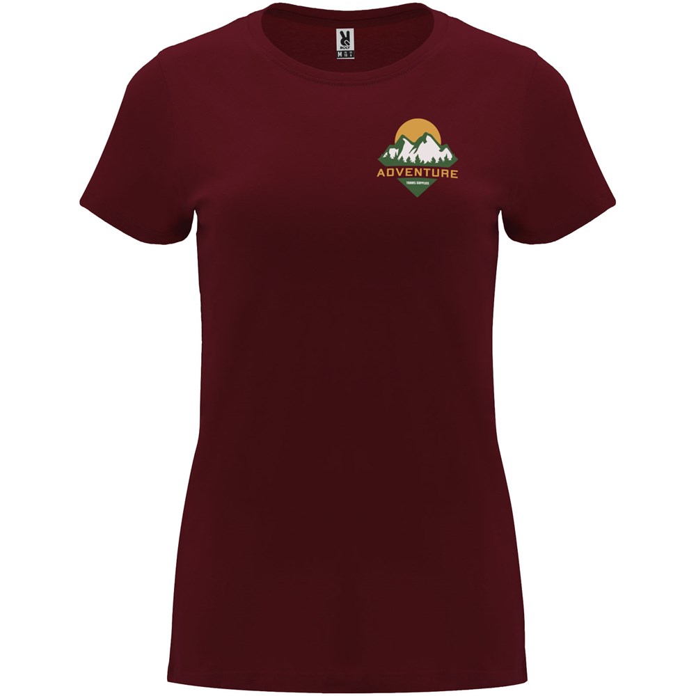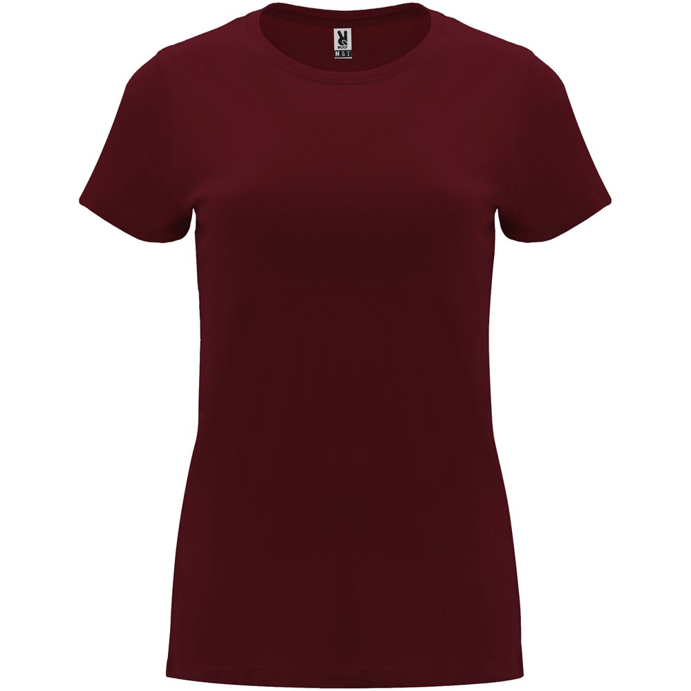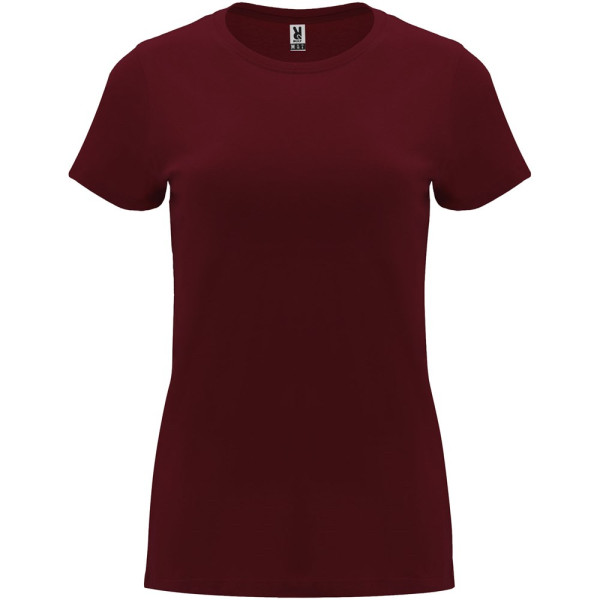Tailliertes kurzärmeliges T-Shirt für Damen. Rundhalsausschnitt mit 1×1 Rippstrick. Verstärkte und verdeckte Nähte am Kragen. Herausnehmbares Etikett.