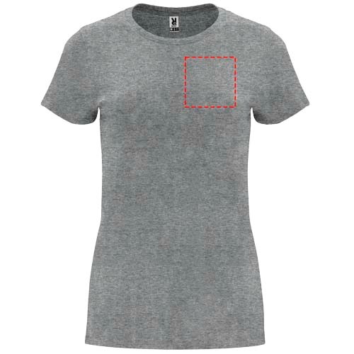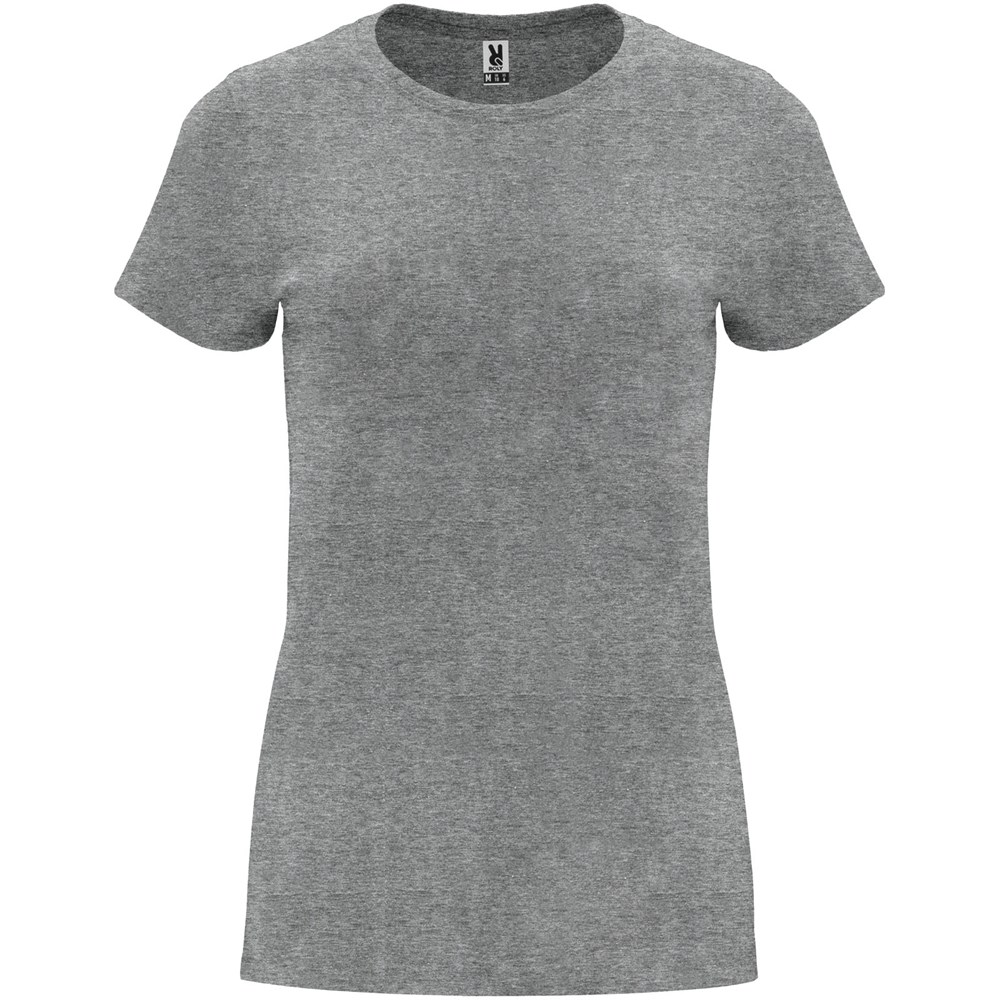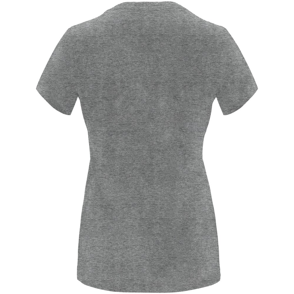 Tailliertes kurzärmeliges T-Shirt für Damen. Rundhalsausschnitt mit 1×1 Rippstrick. Verstärkte und verdeckte Nähte am Kragen. Herausnehmbares Etikett.