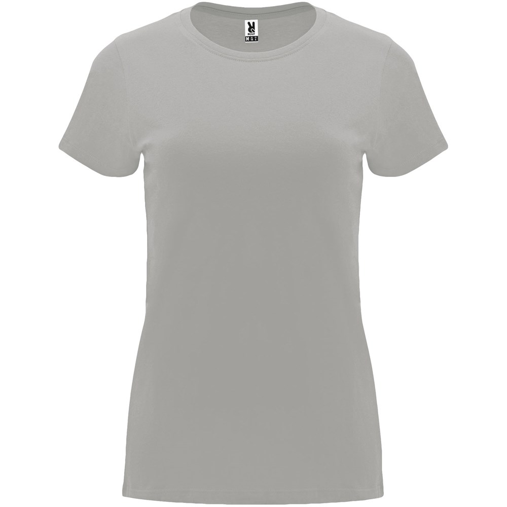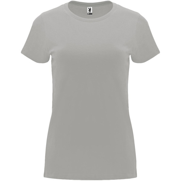 Tailliertes kurzärmeliges T-Shirt für Damen. Rundhalsausschnitt mit 1×1 Rippstrick. Verstärkte und verdeckte Nähte am Kragen. Herausnehmbares Etikett.