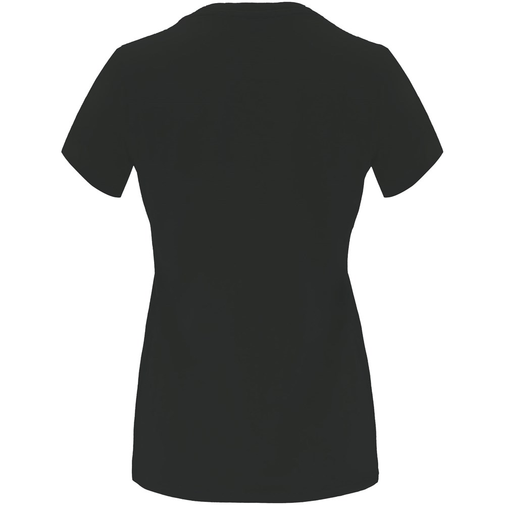 Tailliertes kurzärmeliges T-Shirt für Damen. Rundhalsausschnitt mit 1×1 Rippstrick. Verstärkte und verdeckte Nähte am Kragen. Herausnehmbares Etikett.