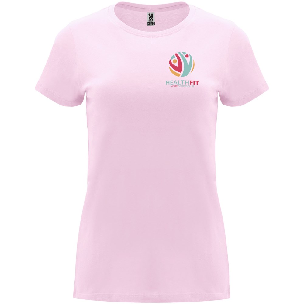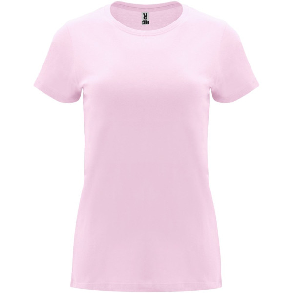 Tailliertes kurzärmeliges T-Shirt für Damen. Rundhalsausschnitt mit 1×1 Rippstrick. Verstärkte und verdeckte Nähte am Kragen. Herausnehmbares Etikett.