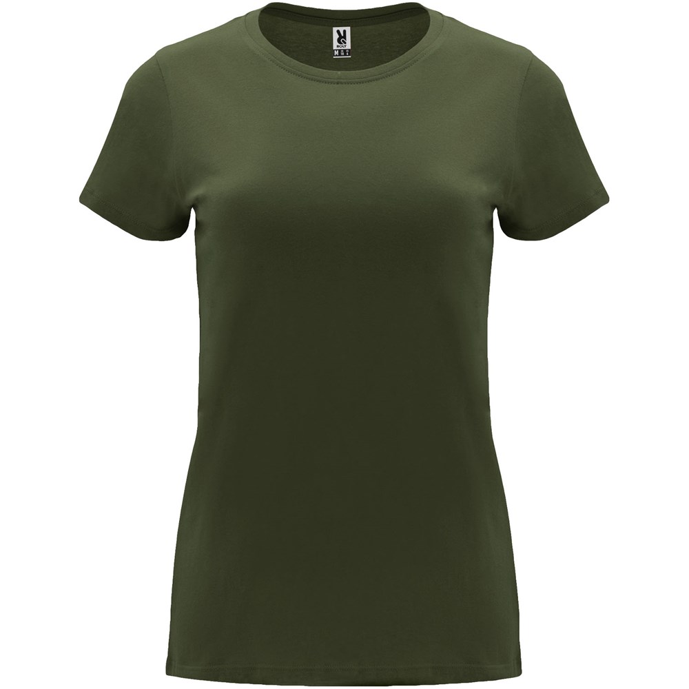Tailliertes kurzärmeliges T-Shirt für Damen. Rundhalsausschnitt mit 1×1 Rippstrick. Verstärkte und verdeckte Nähte am Kragen. Herausnehmbares Etikett.