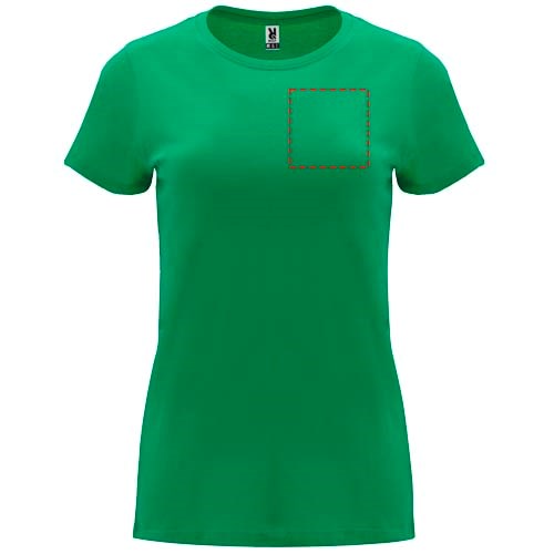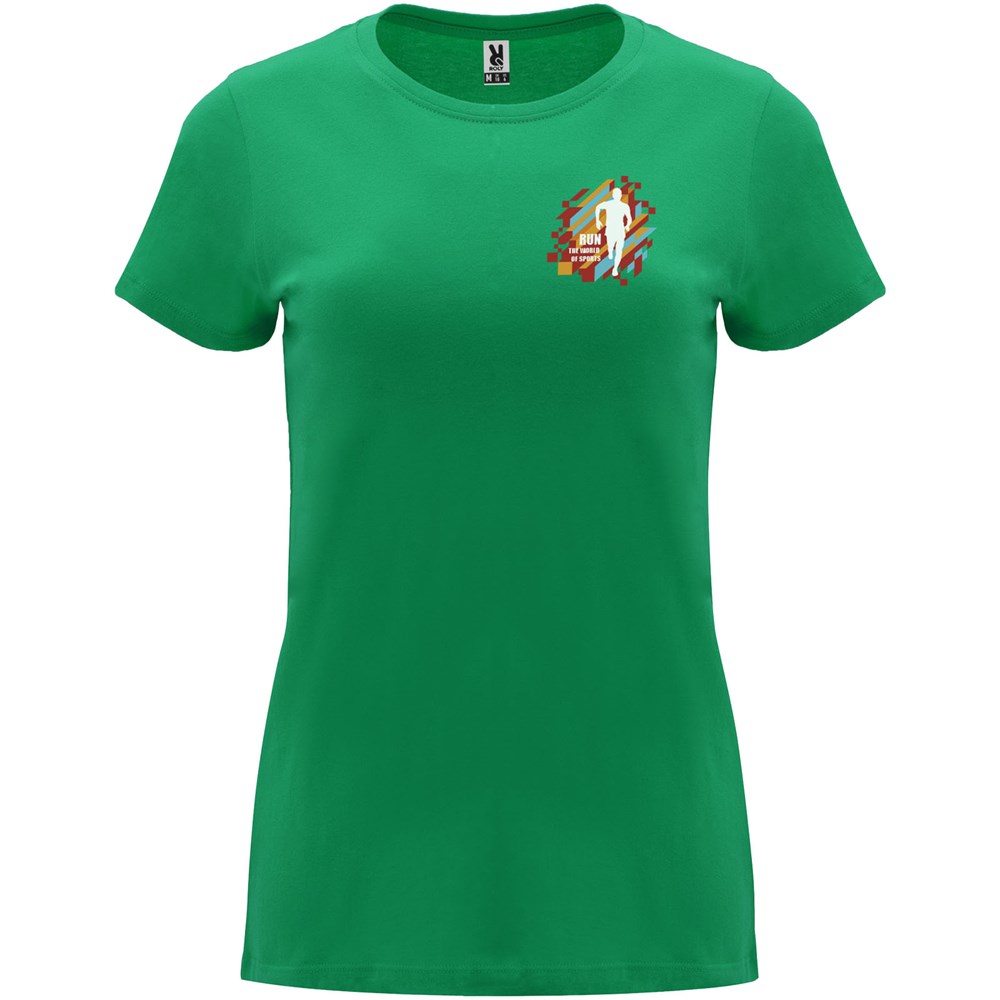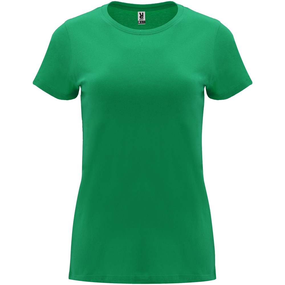 Tailliertes kurzärmeliges T-Shirt für Damen. Rundhalsausschnitt mit 1×1 Rippstrick. Verstärkte und verdeckte Nähte am Kragen. Herausnehmbares Etikett.