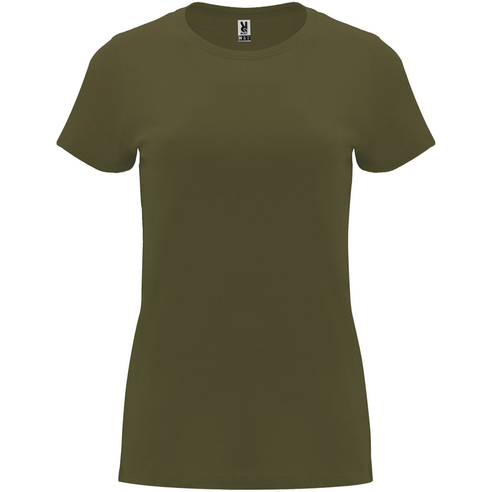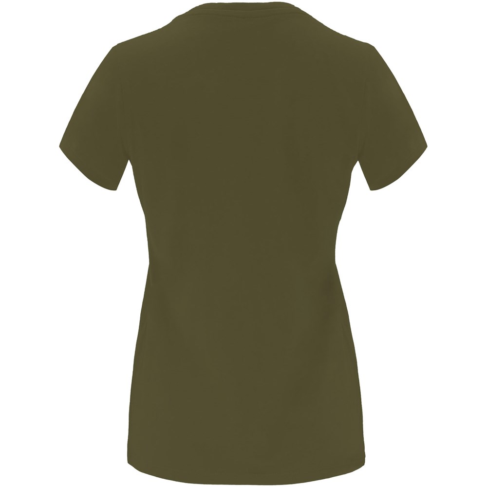 Tailliertes kurzärmeliges T-Shirt für Damen. Rundhalsausschnitt mit 1×1 Rippstrick. Verstärkte und verdeckte Nähte am Kragen. Herausnehmbares Etikett.