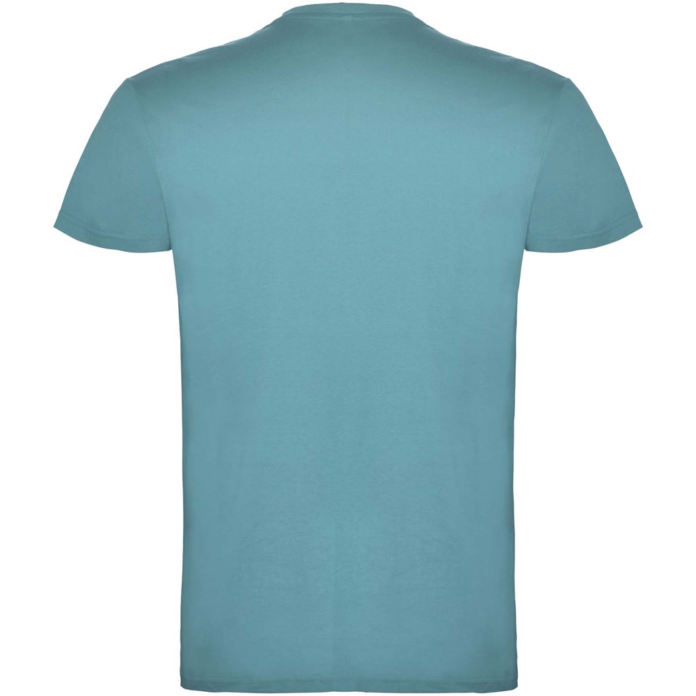 Kurzärmeliges T-Shirt mit doppellagigem Rundhalsausschnitt aus Elasthan, hergestellt aus schlauchförmigem Material für Erwachsene. Verstärkte und verdeckte Nähte am Kragen. Herausnehmbares Etikett. Das Modell ist 190 cm groß und trägt Größe L.