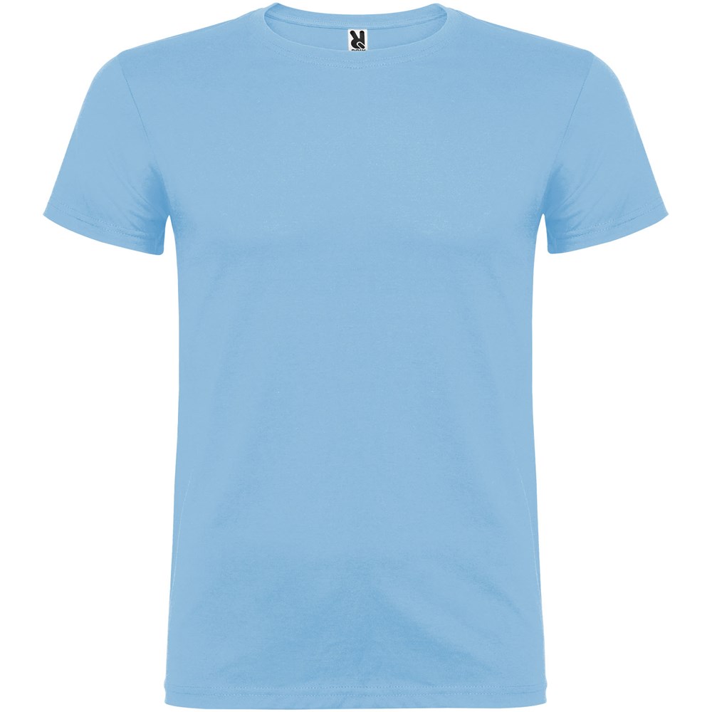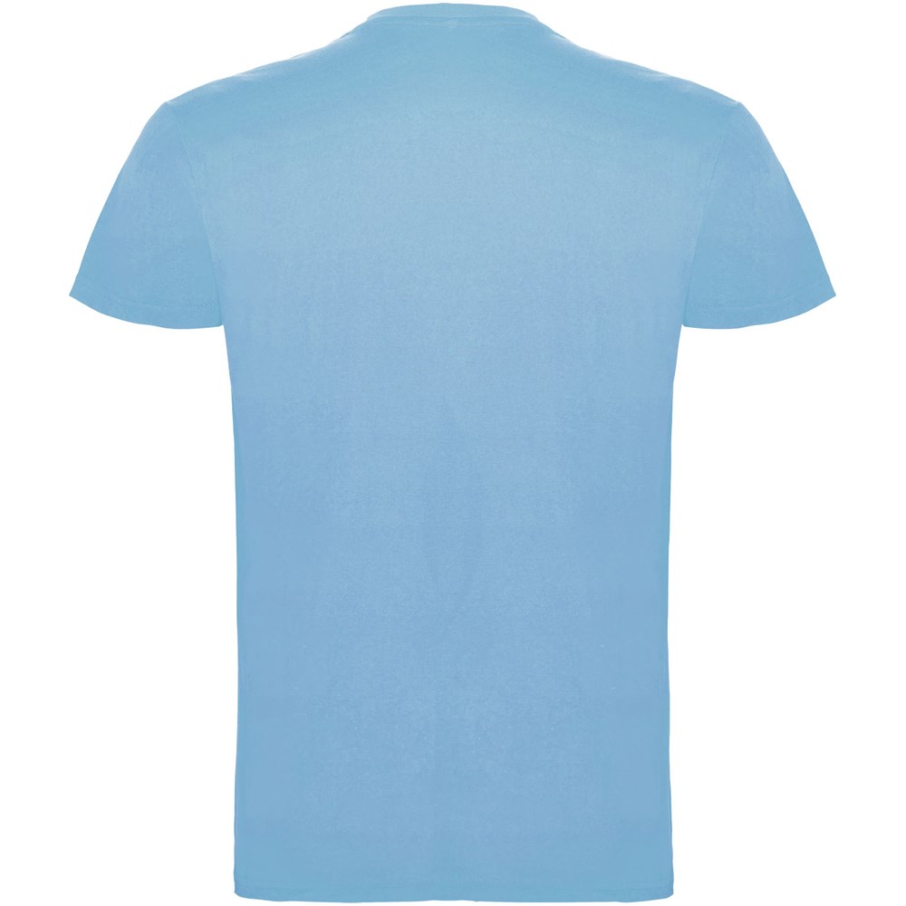 Kurzärmeliges T-Shirt mit doppellagigem Rundhalsausschnitt aus Elasthan, hergestellt aus schlauchförmigem Material für Erwachsene. Verstärkte und verdeckte Nähte am Kragen. Herausnehmbares Etikett. Das Modell ist 190 cm groß und trägt Größe L.