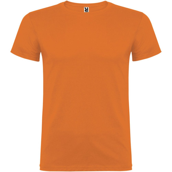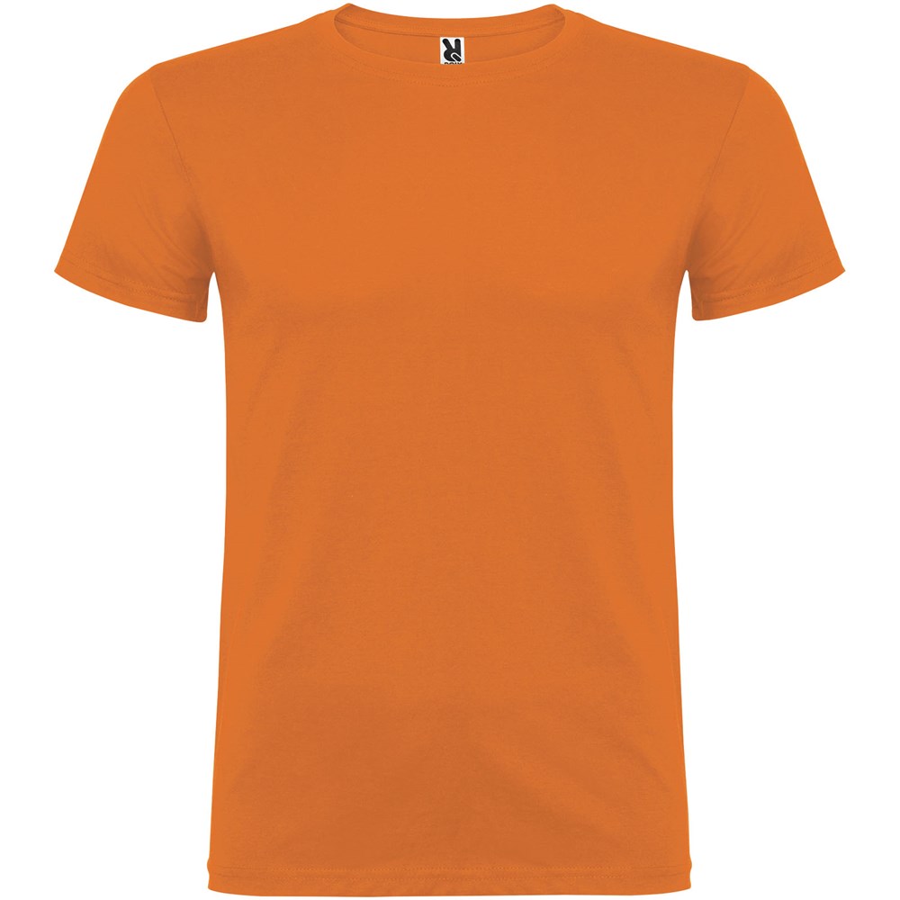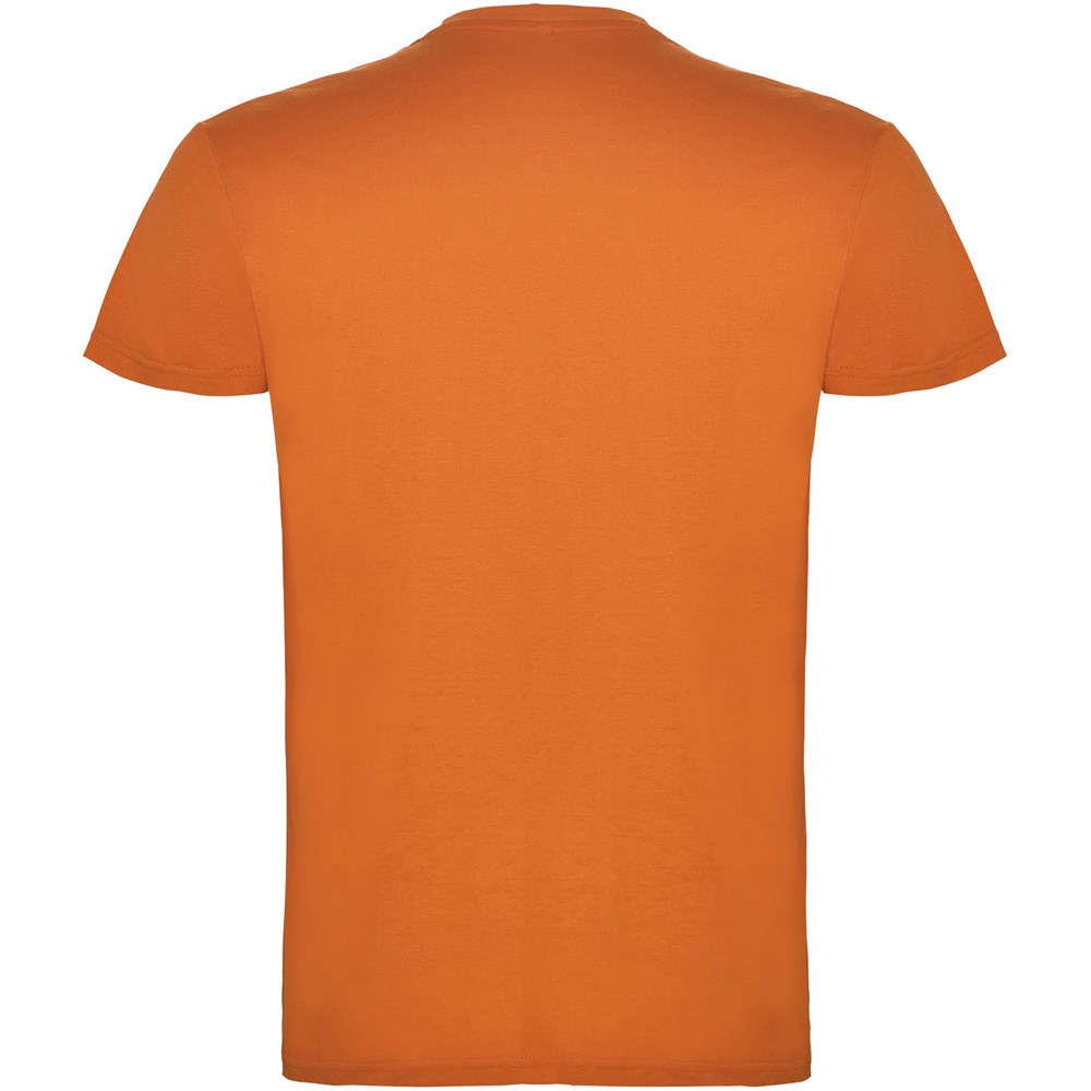Kurzärmeliges T-Shirt mit doppellagigem Rundhalsausschnitt aus Elasthan, hergestellt aus schlauchförmigem Material für Erwachsene. Verstärkte und verdeckte Nähte am Kragen. Herausnehmbares Etikett. Das Modell ist 190 cm groß und trägt Größe L.