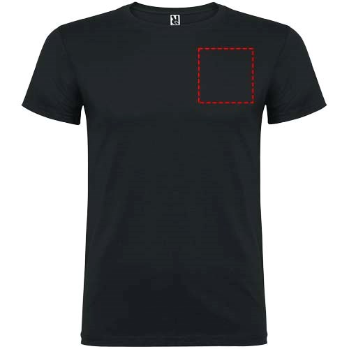 Kurzärmeliges T-Shirt mit doppellagigem Rundhalsausschnitt aus Elasthan, hergestellt aus schlauchförmigem Material für Erwachsene. Verstärkte und verdeckte Nähte am Kragen. Herausnehmbares Etikett. Das Modell ist 190 cm groß und trägt Größe L.