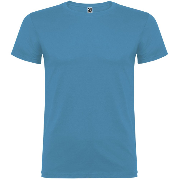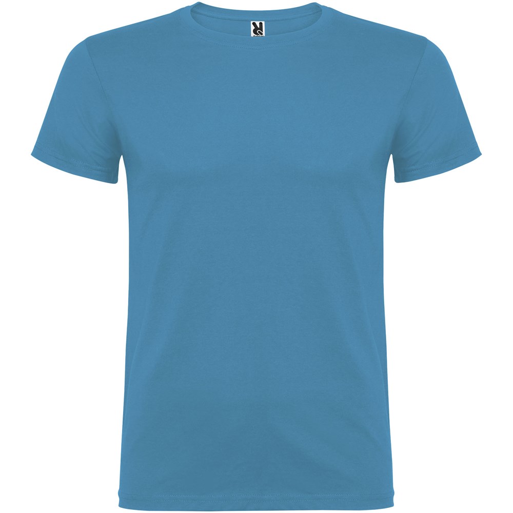 Kurzärmeliges T-Shirt mit doppellagigem Rundhalsausschnitt aus Elasthan, hergestellt aus schlauchförmigem Material für Erwachsene. Verstärkte und verdeckte Nähte am Kragen. Herausnehmbares Etikett. Das Modell ist 190 cm groß und trägt Größe L.