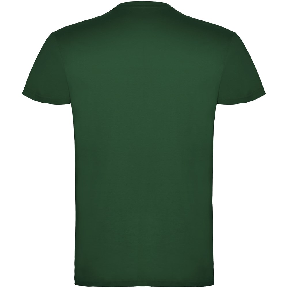 Kurzärmeliges T-Shirt mit doppellagigem Rundhalsausschnitt aus Elasthan, hergestellt aus schlauchförmigem Material für Erwachsene. Verstärkte und verdeckte Nähte am Kragen. Herausnehmbares Etikett. Das Modell ist 190 cm groß und trägt Größe L.