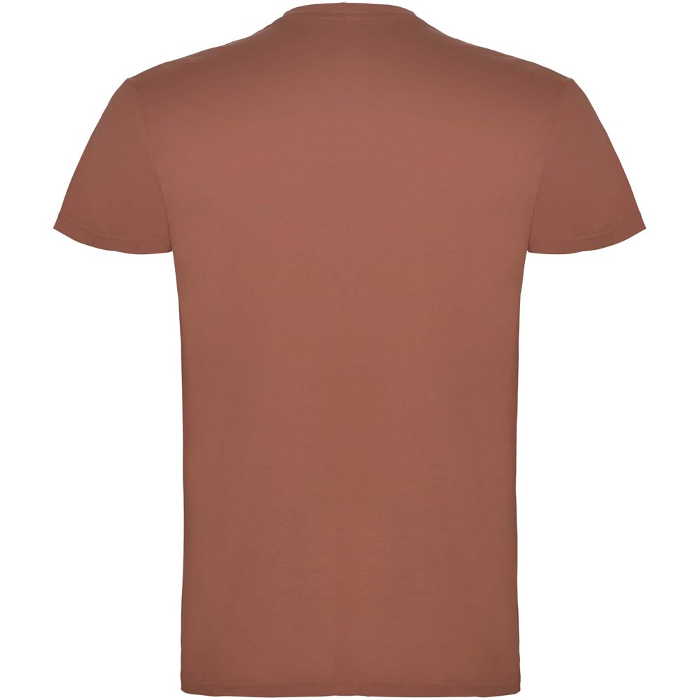 Kurzärmeliges T-Shirt mit doppellagigem Rundhalsausschnitt aus Elasthan, hergestellt aus schlauchförmigem Material für Erwachsene. Verstärkte und verdeckte Nähte am Kragen. Herausnehmbares Etikett. Das Modell ist 190 cm groß und trägt Größe L.