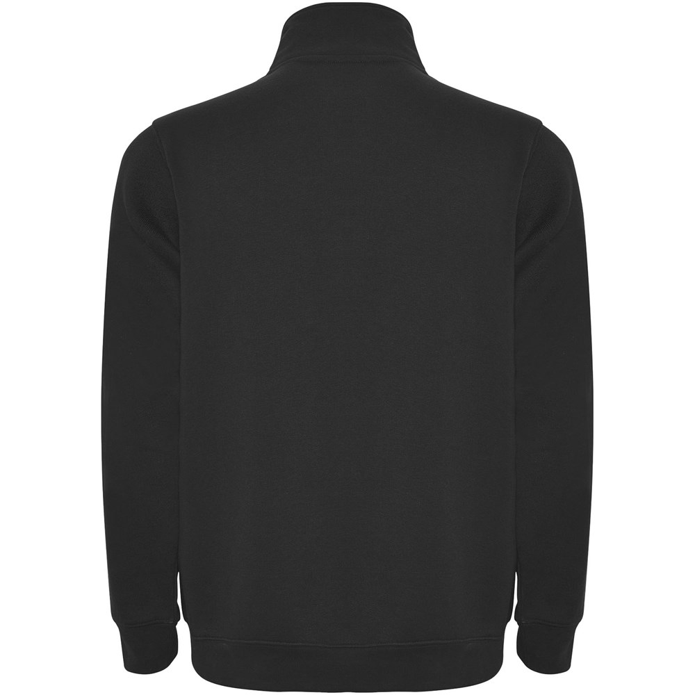 Sweatshirt mit passendem halben Reißverschluss und Polokragen. Passender Innenkragen. Verstärkte, abgedeckte Nähte am Innenkragen. 1×1 Rippbündchen an Ärmeln und Taille. Das Modell ist 185 cm groß und trägt Größe M.