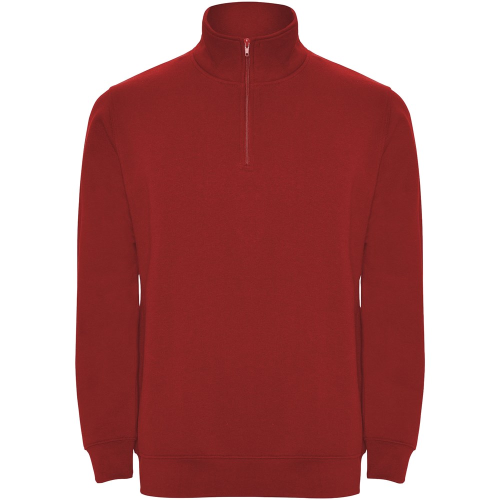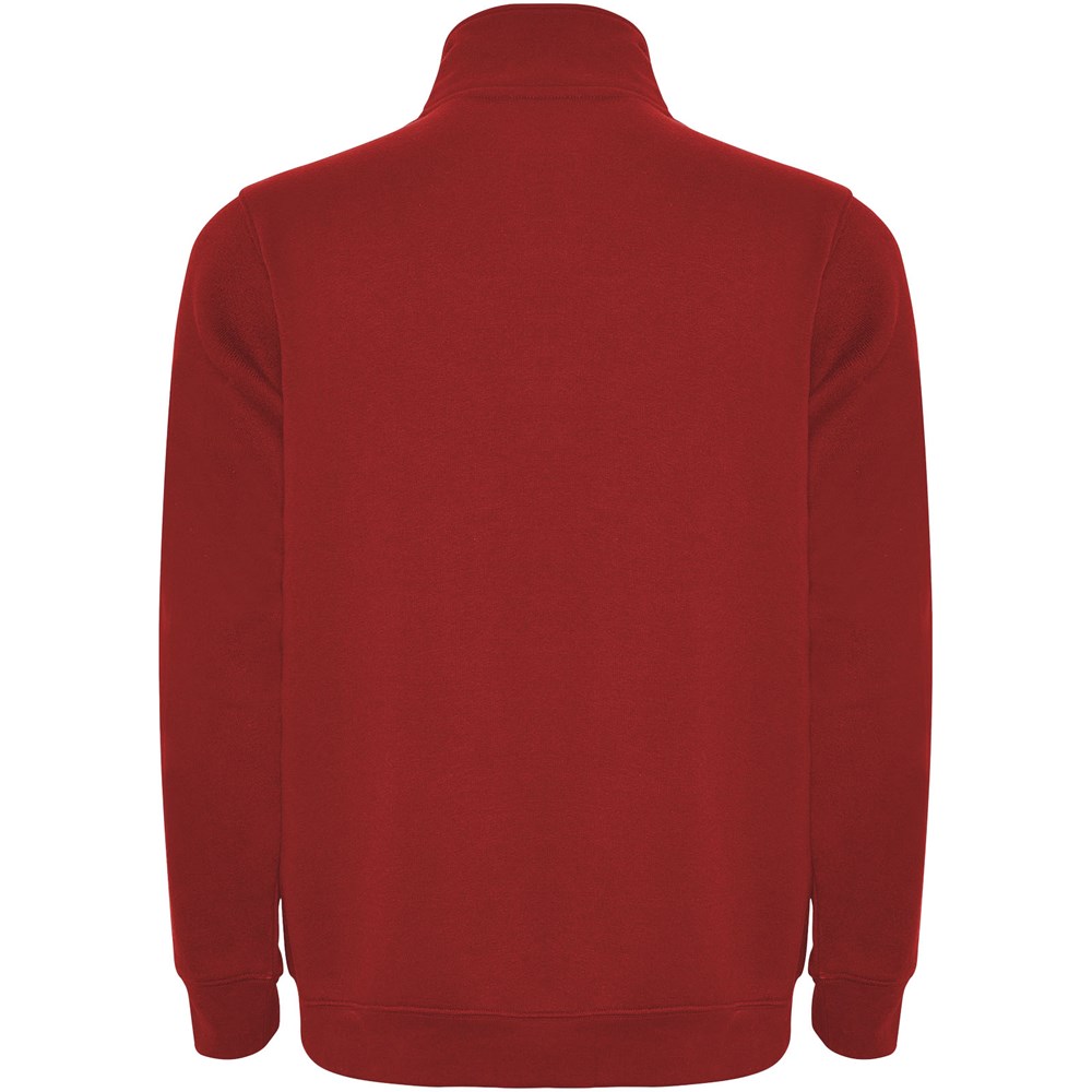 Sweatshirt mit passendem halben Reißverschluss und Polokragen. Passender Innenkragen. Verstärkte, abgedeckte Nähte am Innenkragen. 1×1 Rippbündchen an Ärmeln und Taille. Das Modell ist 185 cm groß und trägt Größe M.