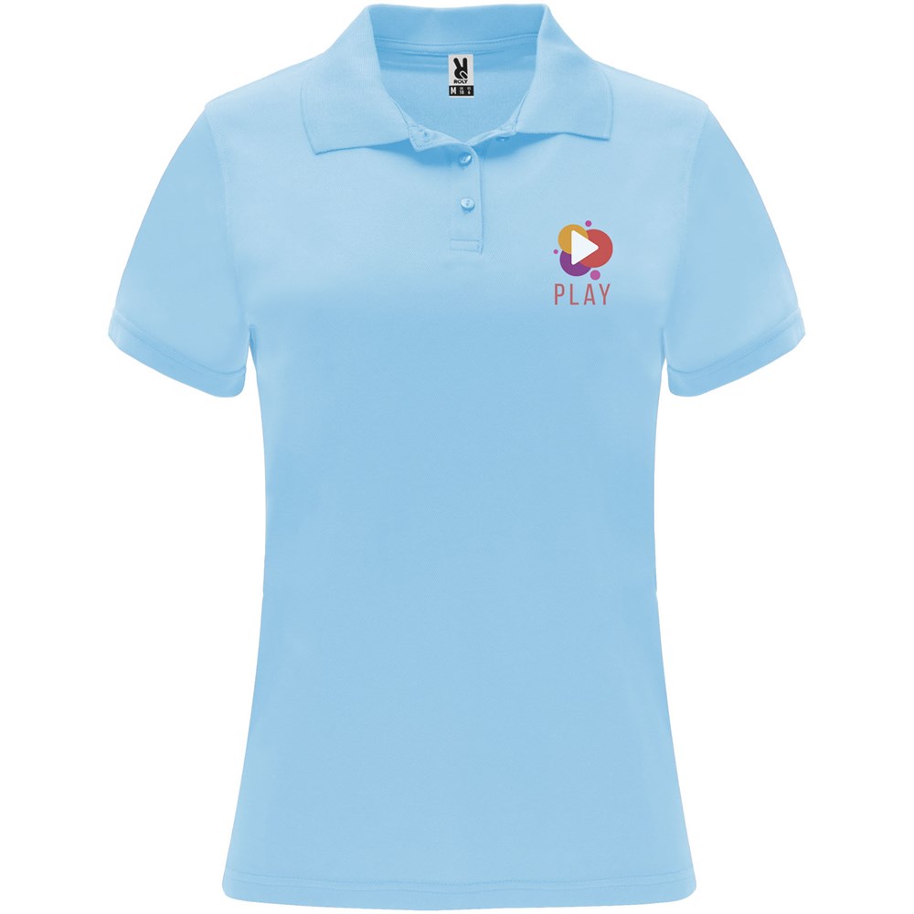 Kurzärmeliges Funktions-Poloshirt für Damen. Gestrickter Kragen mit 3-Knopfleiste. Figurbetonte Passform. Atmungsaktives, leicht zu waschendes und zu trocknendes Material. Herausnehmbares Etikett. Technisches Gewebe. Atmungsaktiver Stoff. Das Modell ist 173 cm groß und trägt Größe S.
