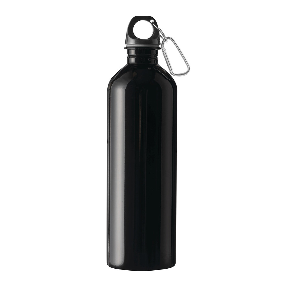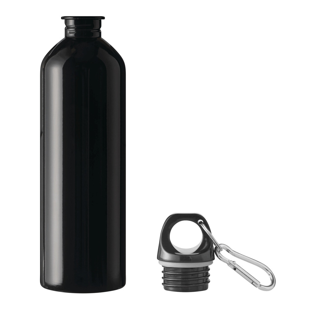 Trinkflasche STEELTRANSIT, einwandig: aus recyceltem Edelstahl, schwarzer Kunststoff-Deckel mit sicherem Schraubverschluss, Silikon-Dichtring, Tragegriff, Schlüsselring und Karabinerhaken (der Karabiner ist NICHT als Sicherung beim Klettern geeignet), Füllmenge ca. 750 ml