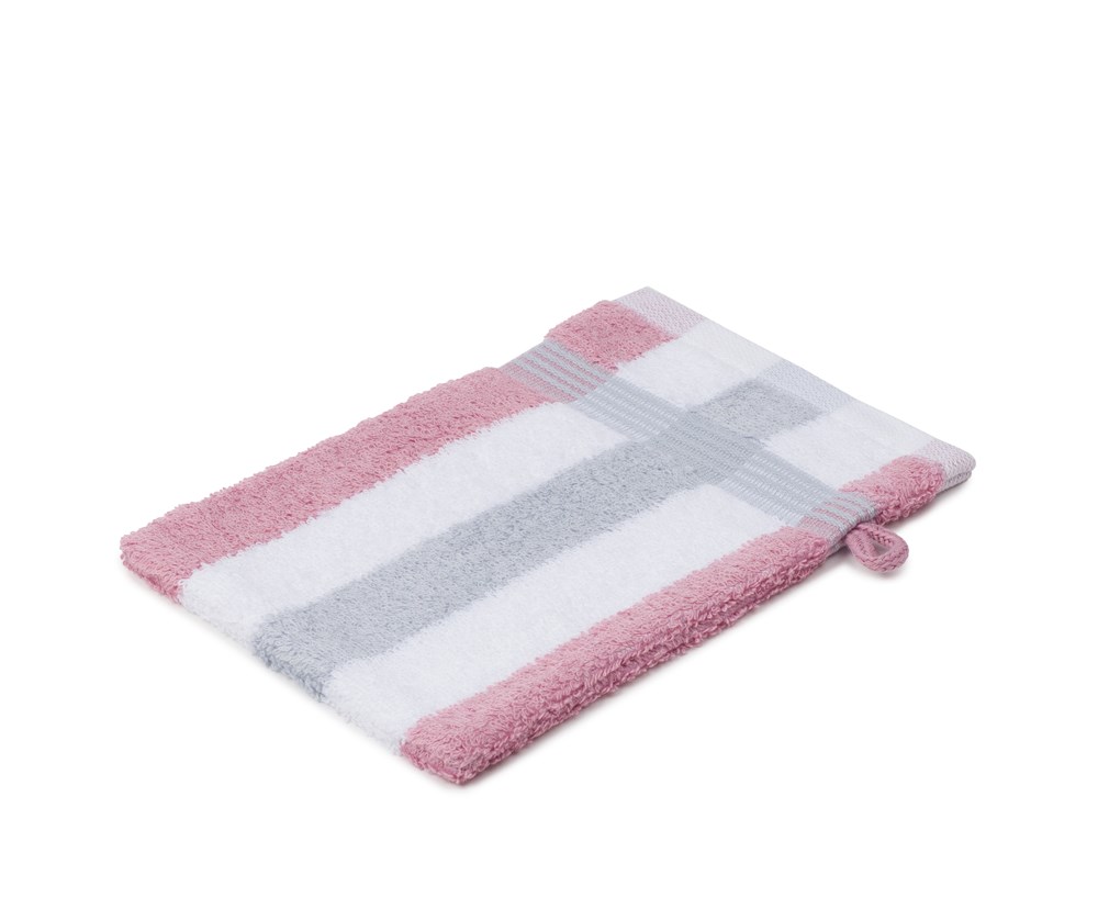 Mehrfarbig gestreiftes Frottier Waschhandschuh mit strukturierter Spannungsfreier Baumwollborte. Extra flauschige, volumenstarke, stabile Grundkonstruktion. Ca. 550g/m²
