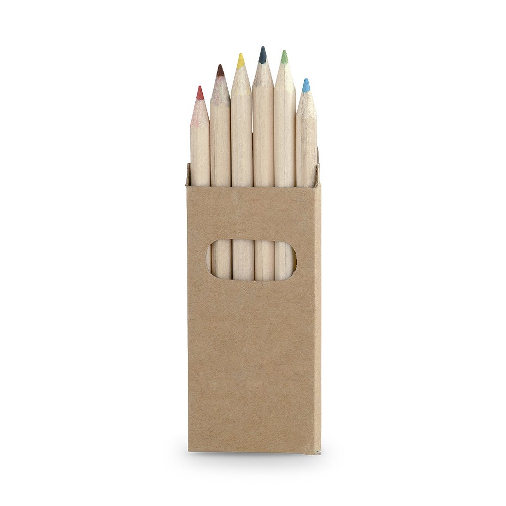 Set aus 6 Buntstiften in einer Schachtel aus Naturkarton mit Fenster. Mit sechseckigem Schaft in Naturfarbe und Minen in verschiedenen Farben.