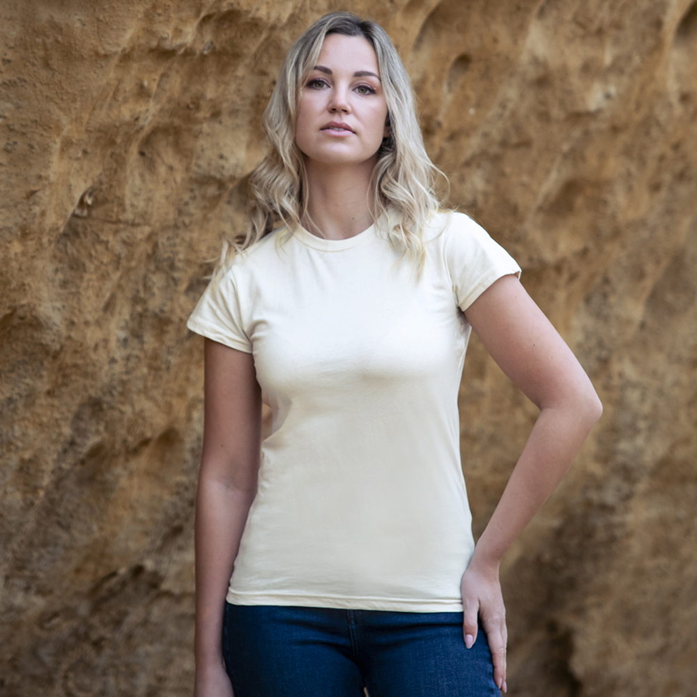 Damen-T-Shirt Keya Organic Natural. Aus 100% Bio-Baumwolle, Single-Jersey-Material 150g/m2, mit natürlichem Finish. Bio-Emblem auf dem Etikett. Erhältlich in den Größen S,M,L,XL,XXL.