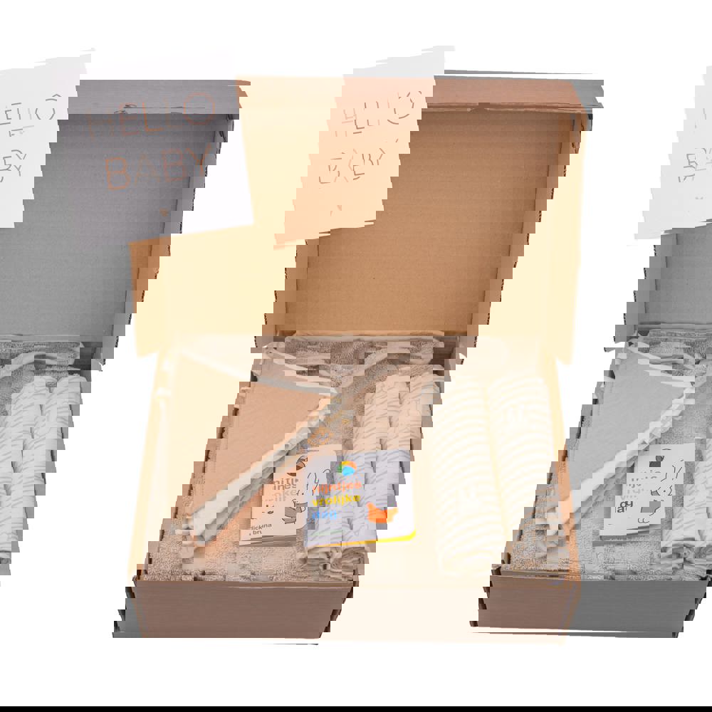 Geburtsgeschenkset L inklusive personalisierte Karte, in Zusammenarbeit mit Jollein. Enthält ein Miffy Bademäntel, 2 Miffy Mulltücher Musselin, ein Miffy Buch und ein Flaggenleine aus Stoff. Verpackt in einer braunen Box mit Hello Baby-Etikett.