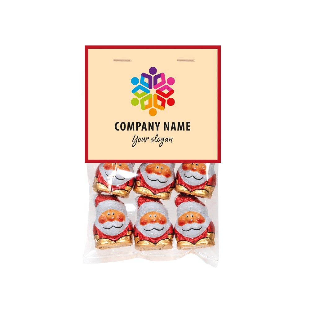 1 Beutel Mini-Weihnachtsmänner aus Vollmilchschokolade 30 g. • Mini-Weihnachtsmänner aus Vollmilchschokolade verpackt in einem Folientütchen mit Standard-Reiter „Merry Christmas“. Mögliche Individualisierung: Reiter mit 4c-Digitaldruck, hierbei können Vorder- und Rückseite bedruckt werden.
