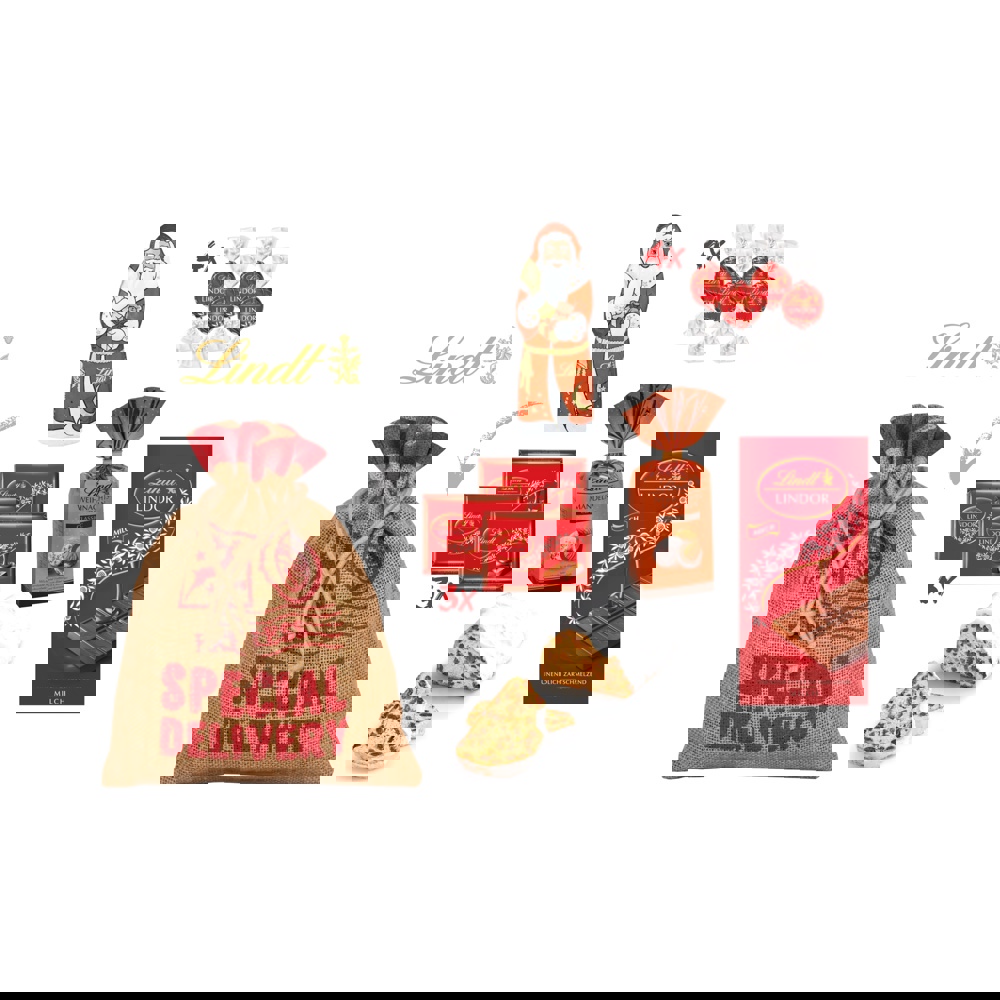 1 weihnachtliches Geschenkset nachhaltig verpackt im Jutebeutel mit Aufdruck „Special Delivery“, gefüllt mit: 1 Gourmet-Christstollen 200 g, 4 Lindt Lindor-Kugeln je 12,5 g, 1 Lindt Lindor-Schokolde 100 g, 1 Lindt Weihnachtsmann 40 g, 1 Beutel Lindt Weihnachtsmandeln 100 g (gerösteten Mandeln in Gianduja Milchschokolade und Vollmilchschokolade) und 3 Lindt Naps Lindor je 7,3 g. • Der Gourmet-Christstollen kann mit einem Kunden-Logo (Etikett 4c) individualisiert werden und auch der Jute-Beutel kann mit einem Anhänger 4c veredelt werden. Das Set kann optional für den Postversand an Mitarbeiter und Kunden einzeln mit Grußkarte im Versandkarton konfektioniert werden.