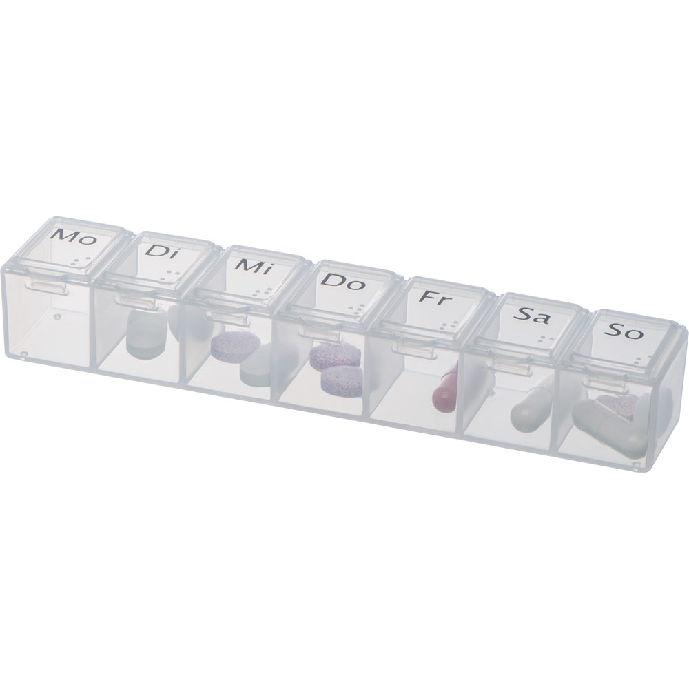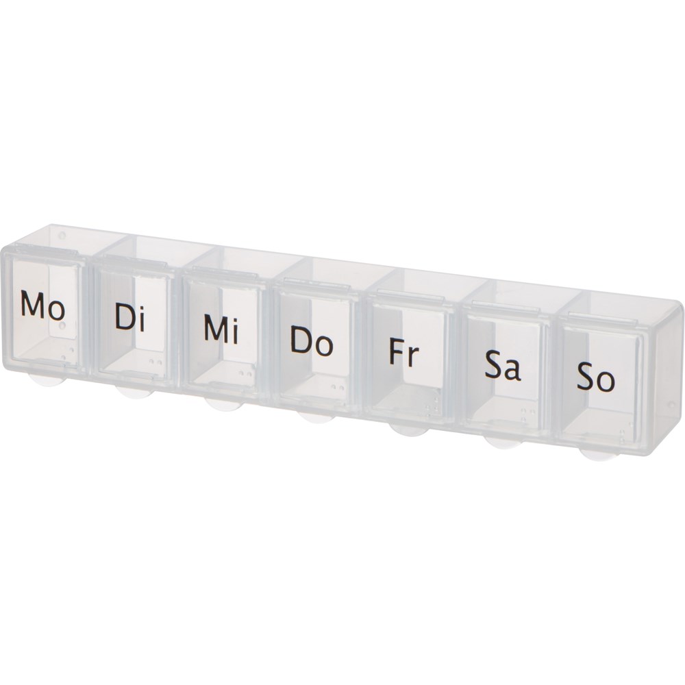7 separate Fächer: Bietet Platz für die tägliche Dosierung von Medikamenten für eine Woche.