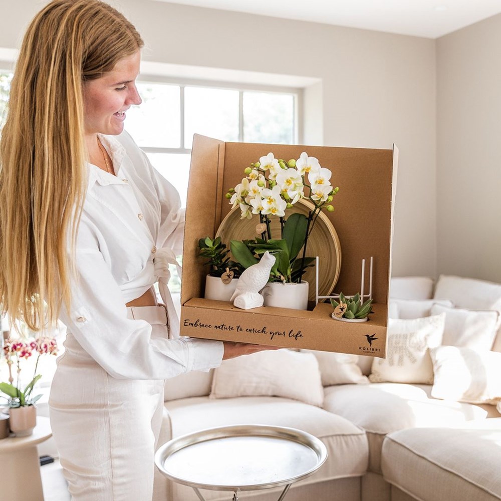 Diese Sets sind sehr pflegeleicht, was sie für jeden, auch ohne grünen Daumen, besonders erfreulich macht. Die Orchidee und die grünen Pflanzen in diesem Set benötigen nur minimale Pflege. Gießen Sie die Orchidee einmal pro Woche, indem Sie den Anzuchttopf in Wasser tauchen, und stellen Sie die Pflanze an einen hellen Ort, jedoch nicht in direktes Sonnenlicht. Die grünen Pflanzen benötigen alle zwei Wochen eine kleine Menge Wasser und bevorzugen einen Platz im Halbschatten. So können Sie wochen- bis monatelang eine wunderschön blühende Orchidee und nachhaltige grüne Pflanzen genießen.