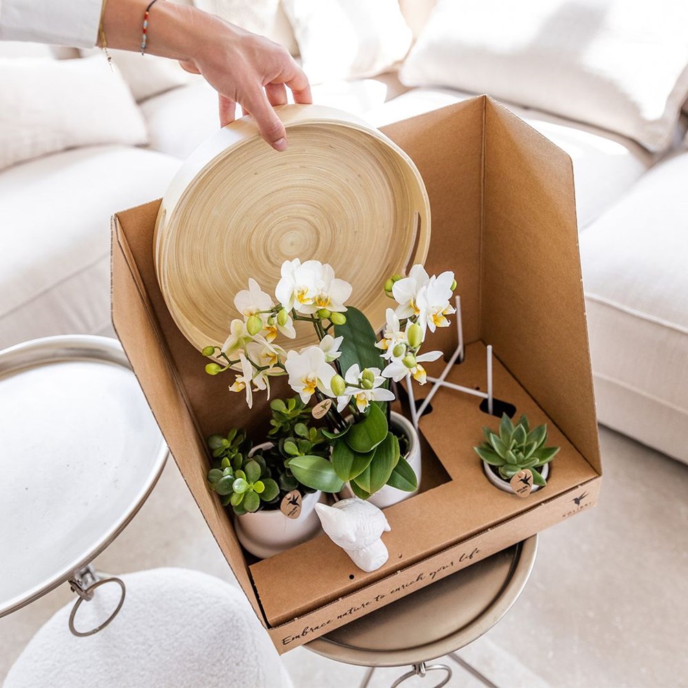 Entfliehen Sie den Standardgeschenken und wählen Sie ein einzigartiges grünes Geschenk, das sowohl Wachstum als auch Blüte umfasst. Das Botanical Giftset small bietet eine elegante Mischung aus Natur und Stil, perfekt für jede Gelegenheit. Dieses Set besteht aus einer wunderschönen Schale, die die Basis des Sets bildet. Auf der Schale steht eine atemberaubende Orchidee in einem Keramiktopf, die in einer transparenten Schutzhülle geliefert wird, um sie zu schützen. Zusätzlich finden Sie eine kleine grüne Pflanze, oft eine Rhipsalis oder Sukkulente, in einem Keramiktopf. Alles ist sorgfältig in einer schönen Geschenkbox verpackt, sodass das Geschenk sofort bereit zum Verschenken ist. All dies kommt direkt aus der Gärtnerei, sodass Sie frische und hochwertige Pflanzen erhalten.